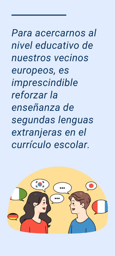 Para acercarnos al nivel educativo de nuestros vecinos europeos, es imprescindible reforzar la enseñanza de segundas lenguas extranjeras en el currículo escolar. Apostar por una educación plurilingüe de calidad no solo mejoraría la competencia lingüística del alumnado, sino que también impulsaría la competitividad y la integración cultural en el ámbito europeo.